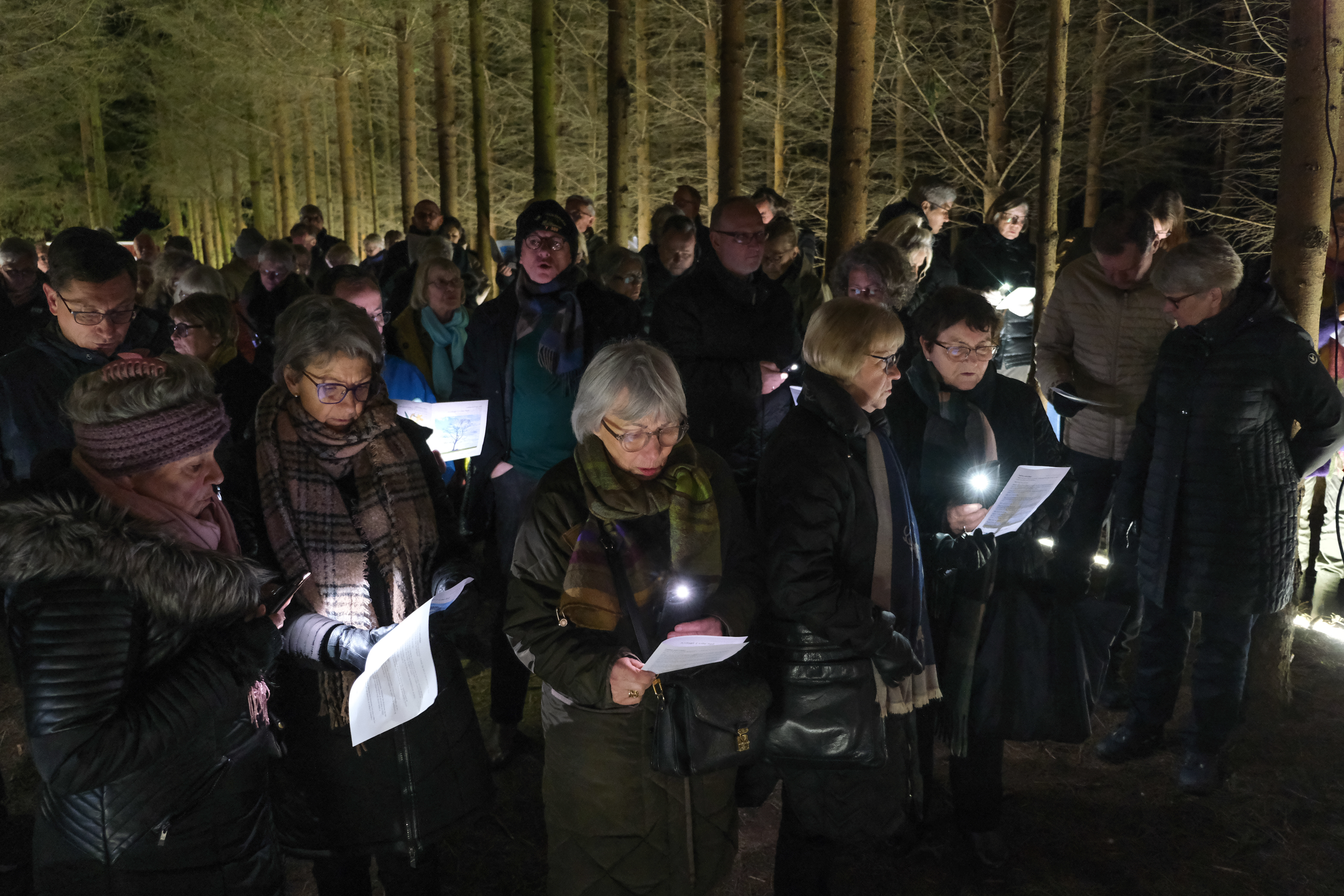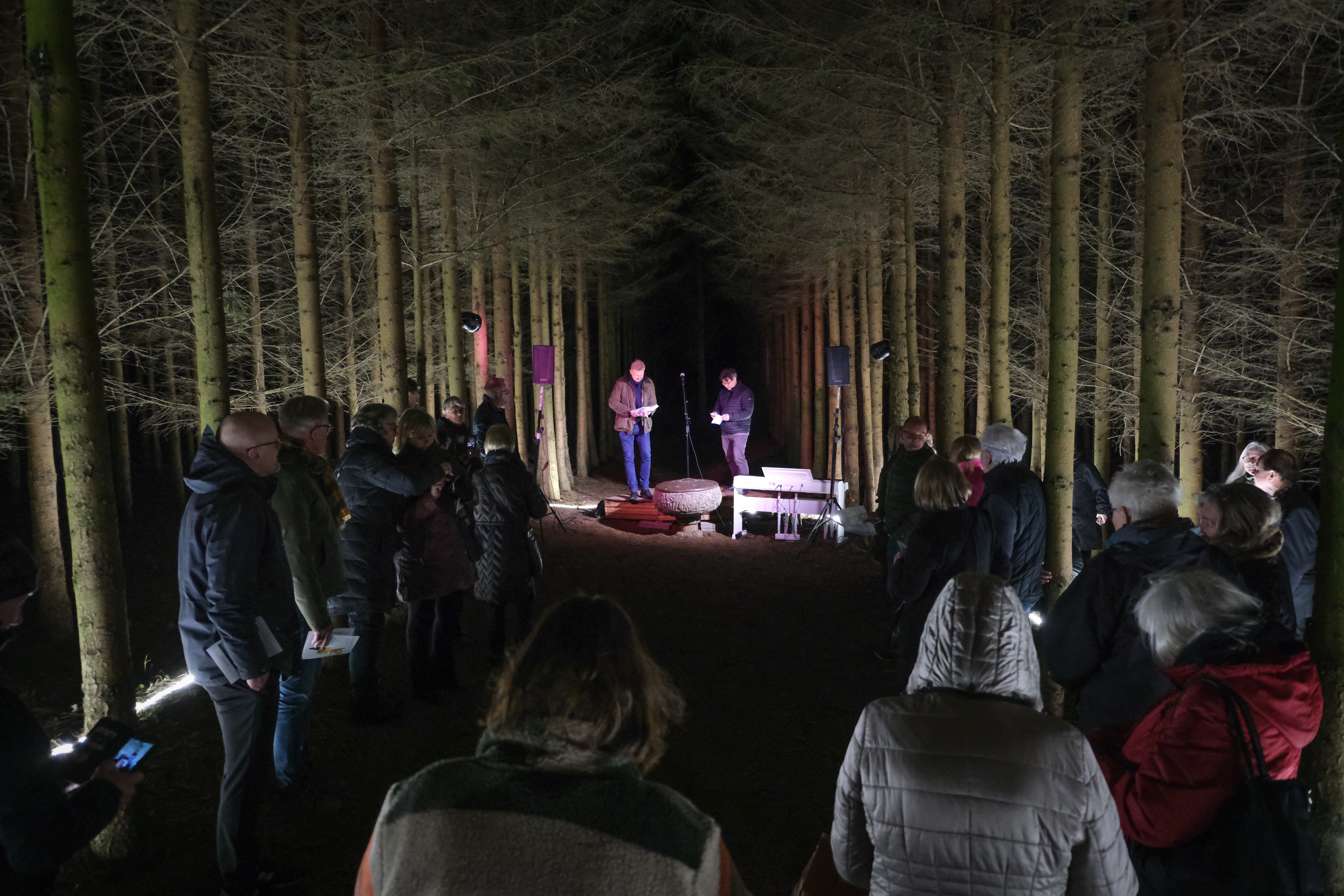 Aftenen sluttede med næsten magisk vandring fra Lillesyd gennem mørket og op til den oplyste granskov, hvor man samledes omkring en døbefont, som Peter Aalbæk har opstillet.