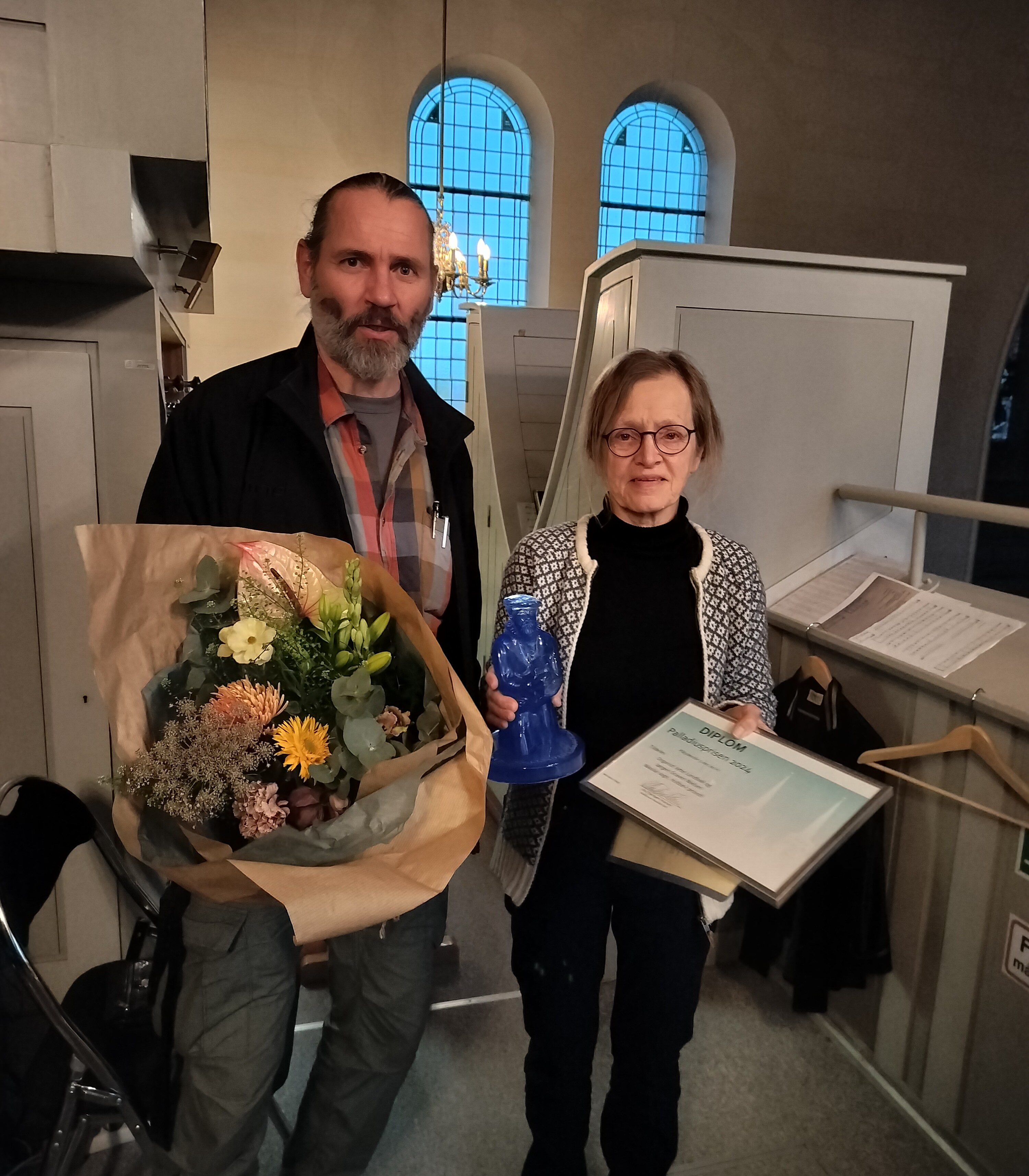 Organist Jytte Lundbak og graver Jørgen Graven Nielsen fra Sankt Nikolai Kirke i Holbæk var ikke til stede på stiftsdagen, men som det ses på billedet fik Jytte Lundbak efterfølgende overrakt prisen af sognepræst Gunder Gundersen. Jytte og Jørgen modtog prisen for deres mangeårige indsats for at udvikle korsang og musik i sognet. Både i forbindelse med spirekor, børnekor, juniorkor, ungdomskor og voksenkor, men også i forbindelse med afholdelsen af koncerter.