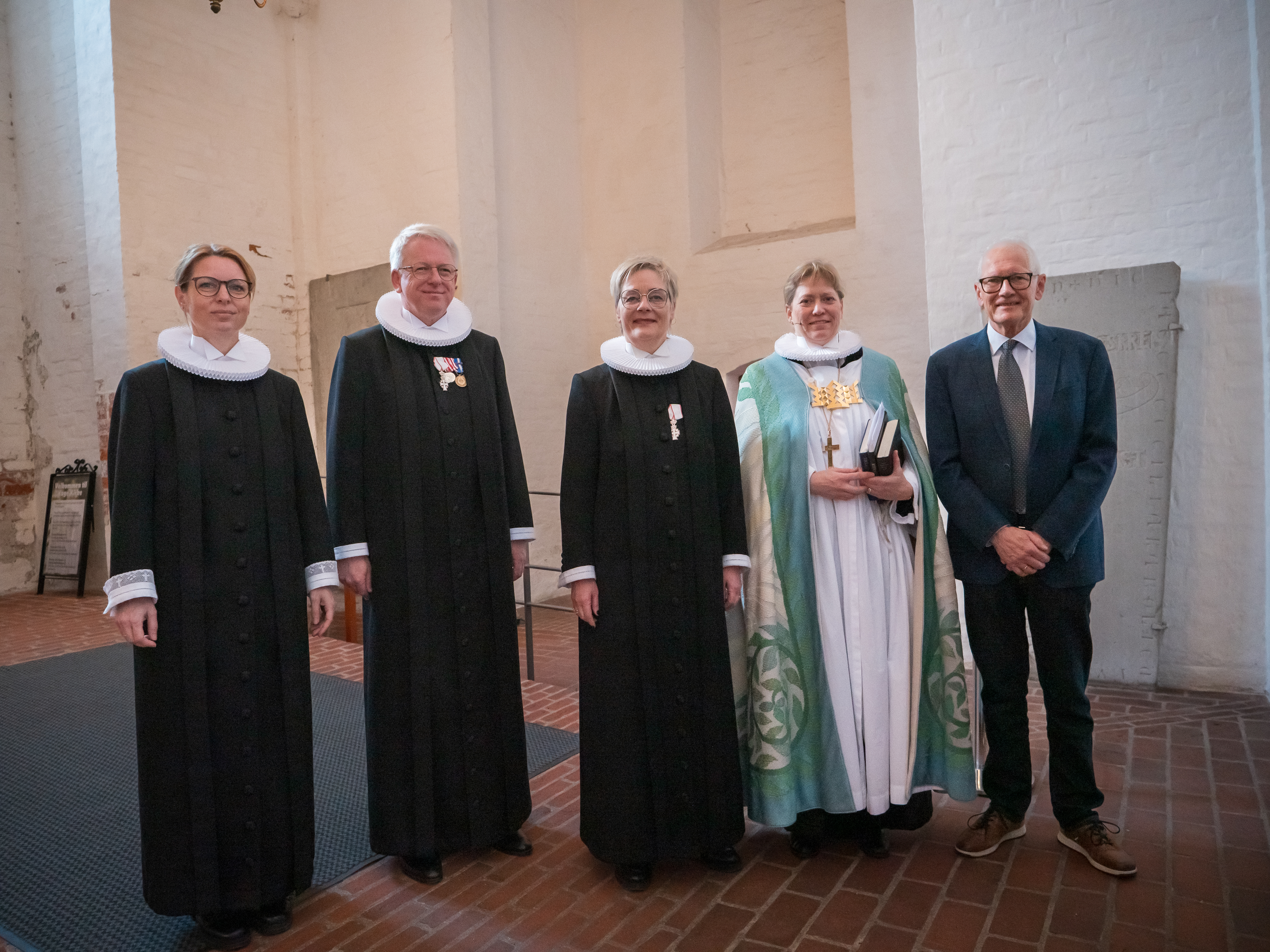 Biskop Ulla Thorbjørn Hansen, og menighedsrådsformand i Køge Kirke Kaj Jensen førte an til festgudstjenesten. Fra venstre sognepræst i Køge Kirke Charlotte Dybdahl, Provst i Køge Provsti Jens Elkjær Petersen, og Domprovst i Roskilde Domprovsti Anne-Sophie Olander Christiansen.