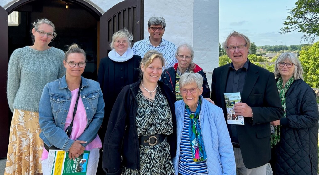 Biskop Ulla Thorbjørn Hansen står forrest ved siden af Ebba Andersen, der kunne fejre 84-års dåbsdag den 4. juni. Bag dem ses menighedsrådsmedlemmer, præst m.fl. ved Fårevejle Kirke. Foto: Roskilde Stift