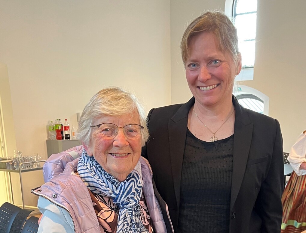Biskop Ulla Thorbjørn Hansen og pastor emeritus Lisbet Foss under andagt i Roskilde Domkirke den 28. april 2023 i forbindelse med markeringen af 75-år for ordinationen af de første kvindelige præster i Danmark. (Foto: Roskilde Stift)