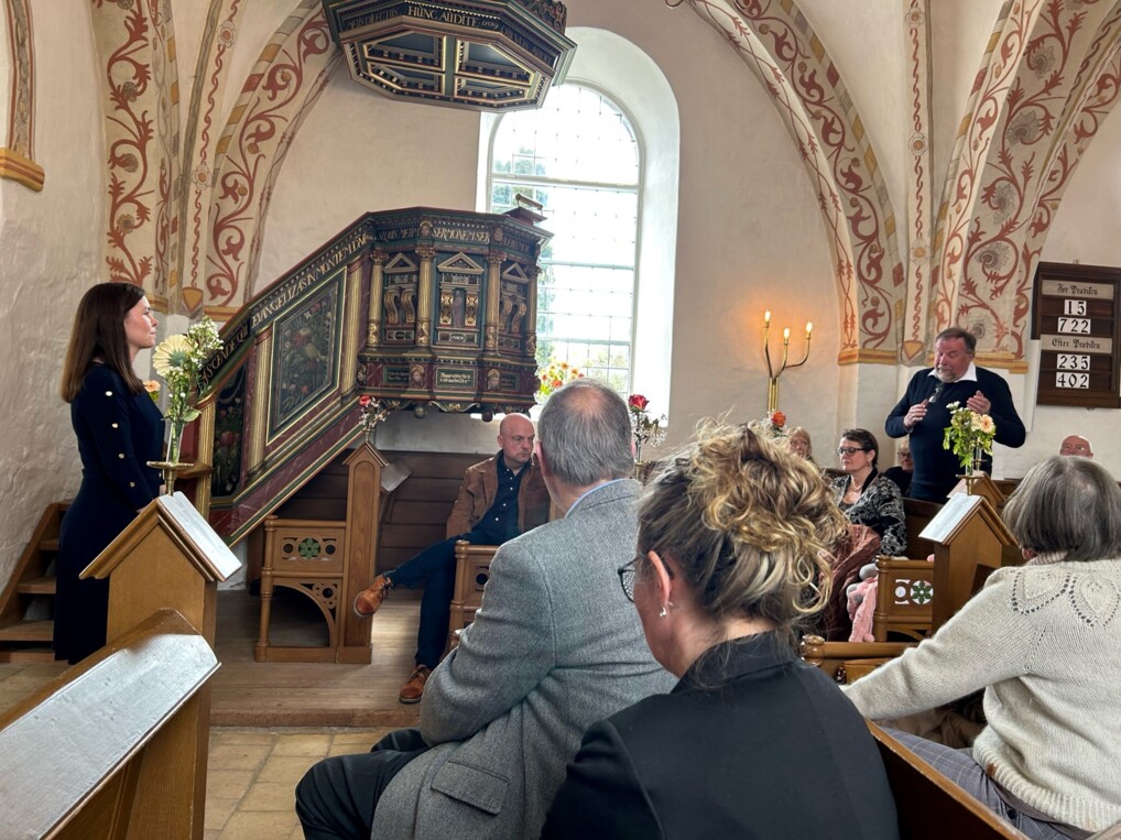 Kirkeminister Louise Schack Elholm svarede på spørgsmål i Gyrstinge kirke den 30. april. (Foto: Privat)