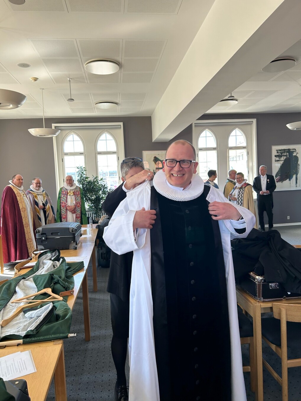 Biskop Mads Davidsen får sin bispekjole og den hvide alba på. (Foto: Privat)